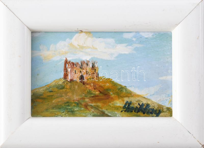 Leírás: Sziklay Juhos Sándor (?-2024): Miniatűr várral. Olaj, farost, jelzett. Keretben. 5×8 cm