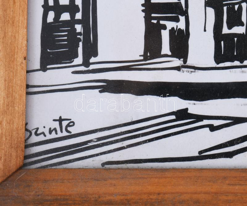Leírás: Szinte Gábor (1928-2012): Firenzei részlet. Tus, papír, jelzett. Üvegezett fakeretben. 28x20 cm.