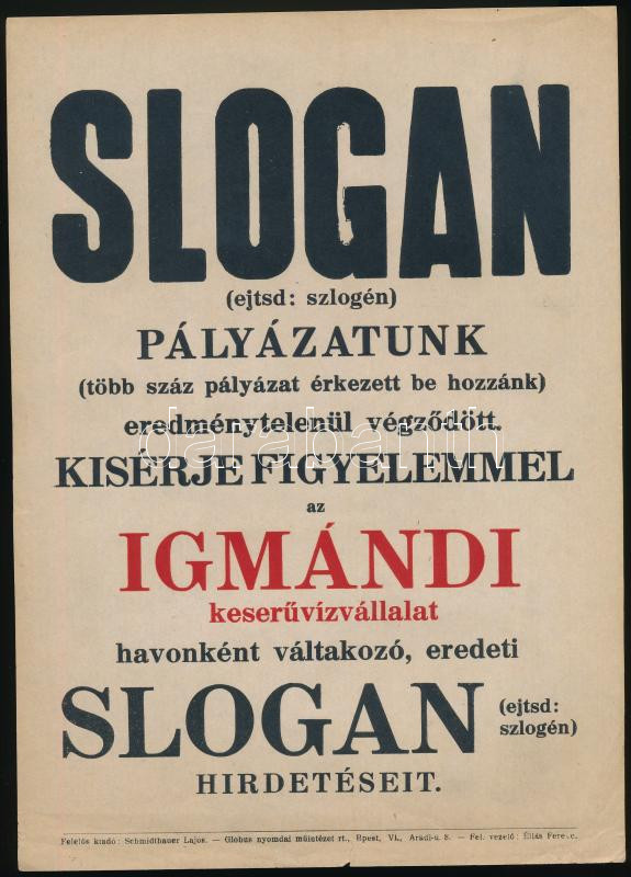 Leírás: Slogan pályázat, Igmándi természetes keserűvíz kisplakát, papír, Globus-Nyomda, Bp., lapszéli apró szakadásokkal, 24×17 cm