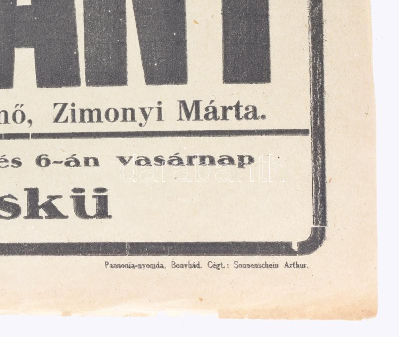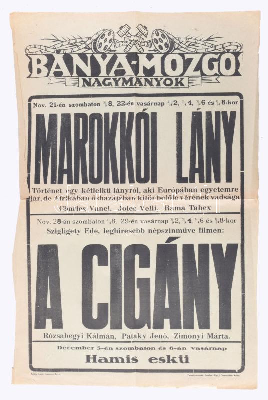 cca 1942-43 Marokkói lány, A cigány többek közt Rózsahegyi Kálmán szereplésével, Nagymányoki Bánya-mozgó mozi plakátja, papír. Pannónia-Nyomda, Bonyhád, hajtásnyomokkal, lapszéli szakadásokkal, 47,5x31 cm. Ritka!