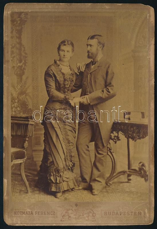 Leírás: 1881 Házaspár portréja, keményhátú fotó Kozmata Ferenc budapesti műterméből, sarkain sérüléssel, hátoldala foltos, 16,5×10,5 cm