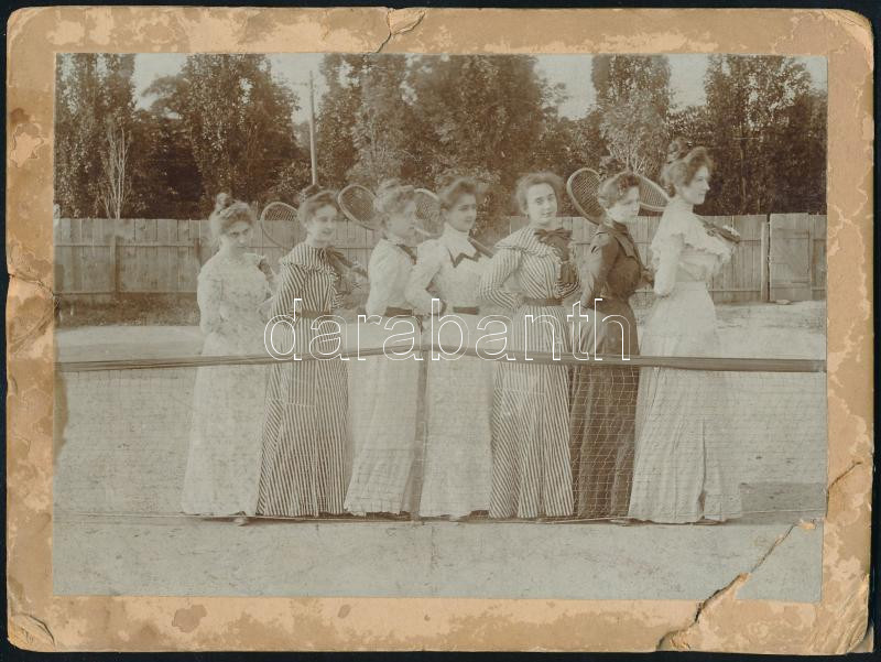 1900 Versec, teniszező hölgyek, keményhátú fotó, a hátoldalon feliratozva, Czakó(?) László ezredorvos aláírással, sérült, jobb alsó sarka javított, 14x19 cm