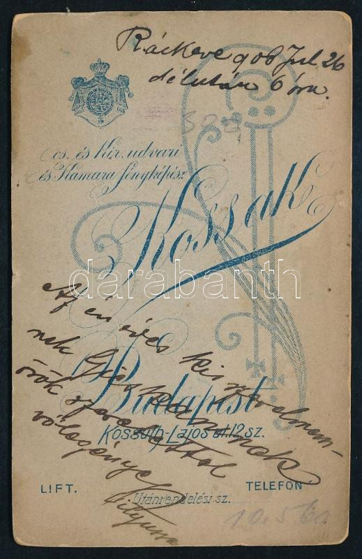 Leírás: 1908 Vőlegény portréja, keményhátú fotó Kossak József budapesti műterméből, hátoldalon feliratozva, 6,5×10,5 cm