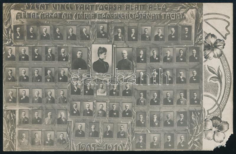 1910 Szent Vince pártfogása alatt álló alkalmazottak Mária kongregációjának tagjai 1905-1910, tablófotó, szecessziós díszítésű fotólap, egyik sarkán kisebb sérüléssel, 9x14 cm