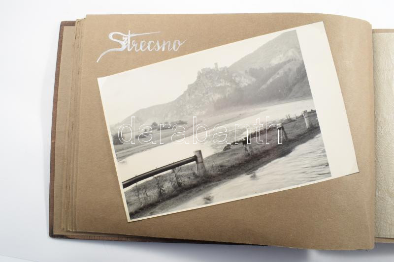 ca 1960 Pozsony, Pöstyén, Tátra fotóalbum 34 db nagy méretű érdekes privát fotóval, fotósarokkal betéve, 22x14 cm, Az album borítója faraott fa, mely a pozsonyi várat ábrázolja.