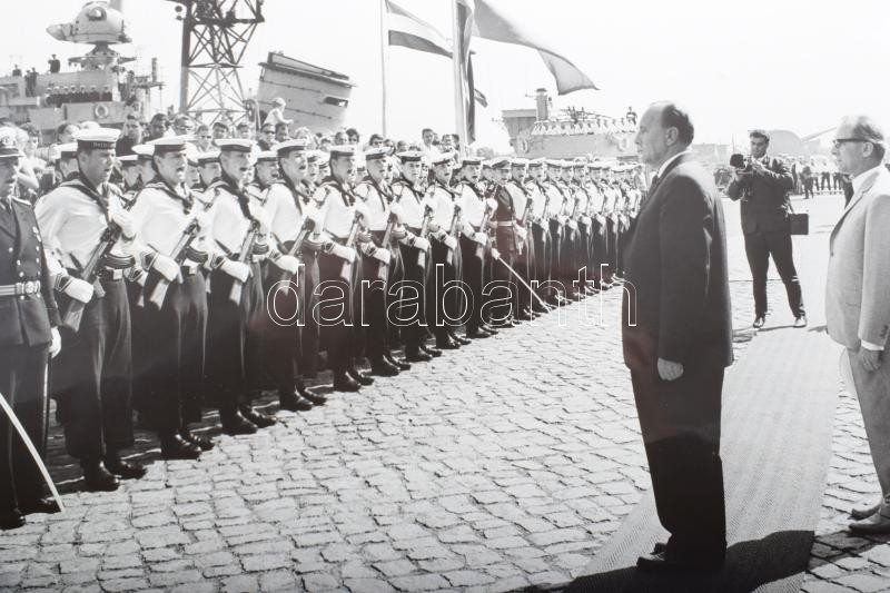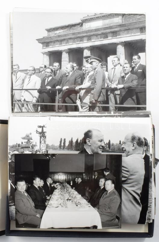ca 1970 Kádár János az NDK-ban. Hivatalos látogatásról készült fotó sorozat, címeres díszdobozban, Kádár hadgyakorlatot néz, Honeckerrel, látogatáson. Német haditengerészet, stb. 32 db 24x16 cm-es fotó