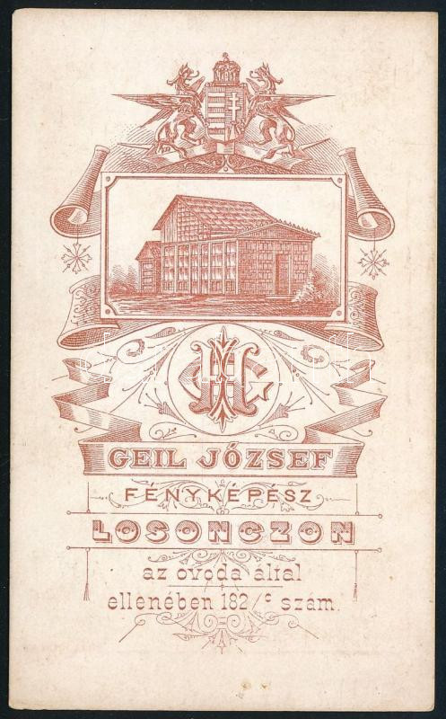 Leírás: cca 1880 Női portré, keményhátú fotó Geil József losonci műterméből, hátoldalon a műterem képével, 10,5×6,5 cm