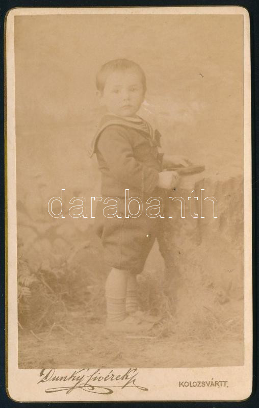 Leírás: cca 1890 Kisgyerek portréja, keményhátú fotó a Dunky fivérek kolozsvári műterméből, 10,5×6,5 cm
