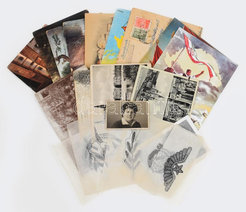 Leírás: cca 1910-1940 vegyes fotó, képeslap és rajz tétel, benne kalauznő fotója, stb