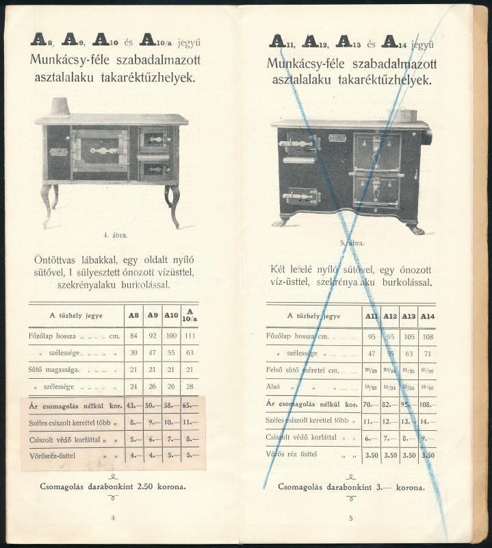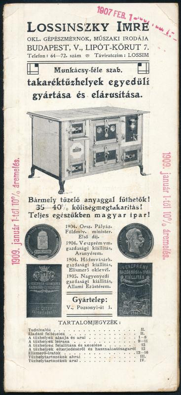 cca 1907 Lossinszky Imre okl. gépészmérnök műszaki irodája, Munkácsy-féle szabadalmazott takaréktűzhelyek képes reklámprospektus, árjegyzék, leporellószerűen kihajtható, 16 p.