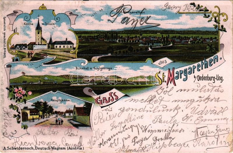 1905 Szentmargitbánya, Szent-Margit, Sankt Margarethen im Burgenland; Kirche und Schule, Bahnhof und Koglgebirge, St. Margarethen, Hauptgasse / templom és iskola, vasútállomás, kőbánya, látkép, Fő utca / church, school, railway station, quarry, mine, general view, main street. A. Schwidernoch Art Nouveau, floral, litho (EK)