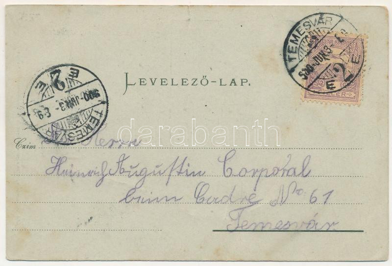 Leírás: 1900 Karánsebes, Caransebes; Fő utca, Lichtneckert szálloda / main street, hotel. Art Nouveau, floral (szakadás / tear)