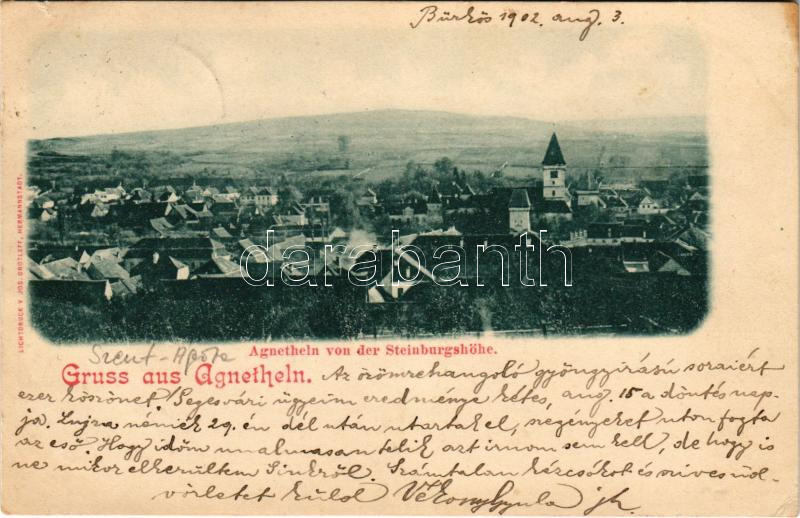 1902 Szentágota, Agnetheln, Agnita; von der Steinburgshöhe. / látkép, evangélikus templom. Lichtdruck v. Jos. Drotleff / general view with Lutheran church (kis szakadás / small tear)