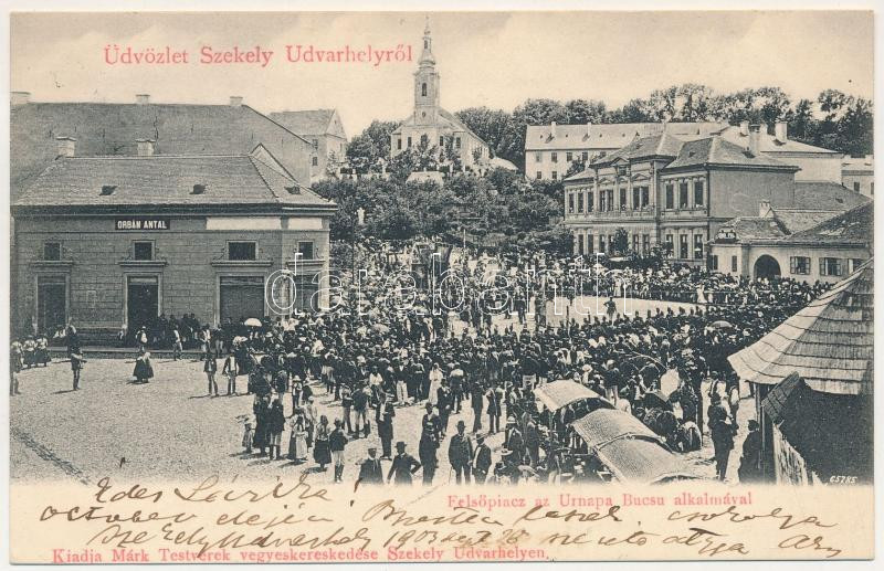 1903 Székelyudvarhely, Odorheiu Secuiesc; Felső piac az Úrnapi Búcsú alkalmával. Körmenet, Orbán Antal üzlete, templom. Márk Testvérek kiadása / Feast of Corpus Christi, procession, market, shops, church