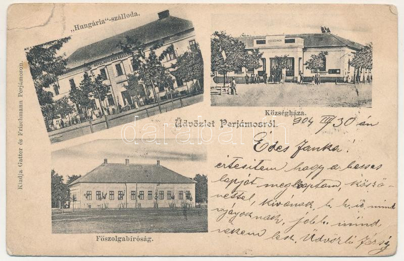 Leírás: 1904 Perjámos, Periam; Hungária szálloda, Községháza, Főszolgabíróság. Gatter és Frischmann kiadása / hotel, town hall, court (szakadás / tear)