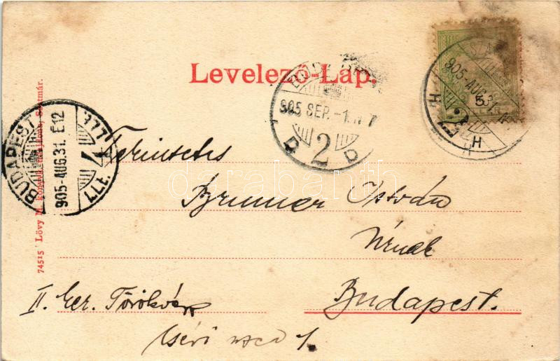 1905 Szatmárnémeti, Szatmár, Satu Mare; Református templom és gimnázium, Singer Co. varrógépek, Freund üzlete. Lövy M. kiadása / Calvinist church and school, shops (ázott sarok / wet corner)