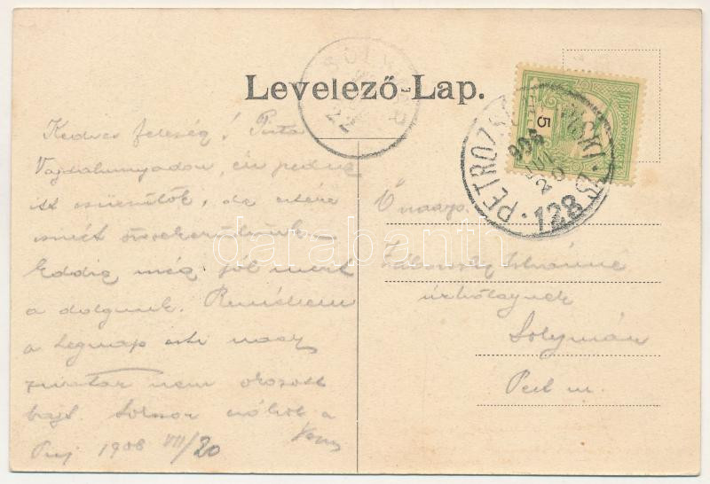 Leírás: 1906 Puj, Pui (Hunyad); látkép, templom. Joánovits János kiadása / general view, church + "PETROZSÉNY - PISKI 128. SZ." vasúti mozgóposta bélyegző