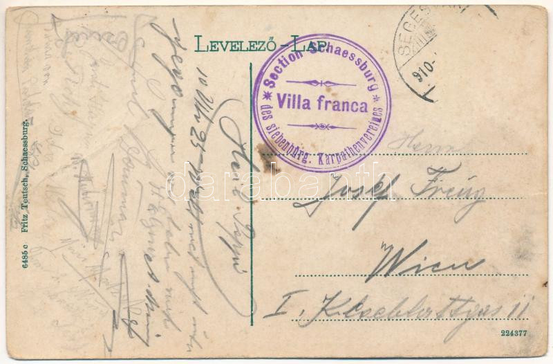 Leírás: 1910 Segesvár, Schässburg, Sighisoara; Stundturm / Óratorony. Fritz Teutsch kiadása / clock tower + "Section Schaessburg der siebenbürg. Karpathenvereines" (fa)