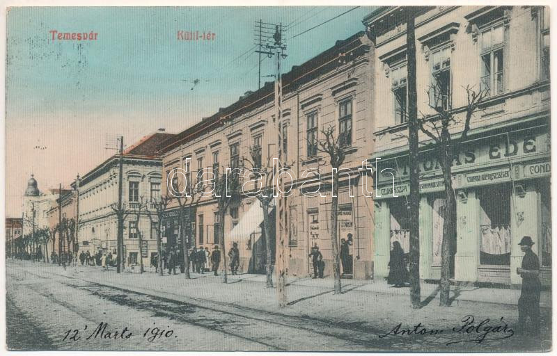 1910 Temesvár, Timisoara; Küttl tér, Thomas Ede cukrászdája, Wolf Mihály, Gerő Manó üzlete és saját kiadása / square, confectionery, publisher's shop (gyűrődés / crease)