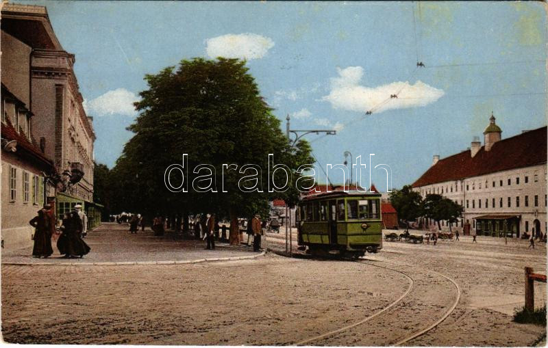 Leírás: 1912 Nagyszeben, Hermannstadt, Sibiu; Hermannsplatz / Hermann tér, jobbra a gyalogsági laktanya, balra a Bretter sétány, villamos. Karl Graef kiadása / square, K.u.K. military infantry barracks, promenade, tram (EK)