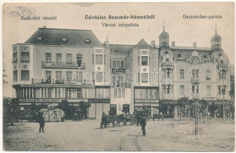 1914 Szatmárnémeti, Szatmár, Satu Mare; Deák tér, Városi bérpalota, Ösztreicher palota, Weisz Izsák, Perlstein, Fried Salamon, Weisz Gyula, Borgida Miklós üzlete, Fonciere Pesti Biztosító Intézet főügynöksége, Szalon kávéház. Weisz Zoltán kiadása / square, palace, shops, insurance company, café (ázott / wet damage)