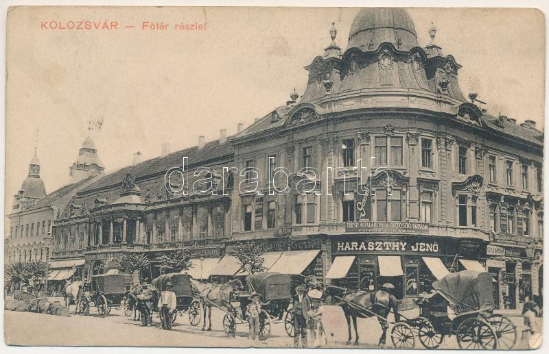 Kolozsvár, Cluj; Fő tér részlet, Haraszthy Jenő, Triesti Általános Biztosító Társaság, Radics Sándor, Jeney Lajos, Kiss János Fiai üzlete. Ludasi dohánytőzsde kiadása / main square, insurance company, shops (kopott sarkak / worn corners)