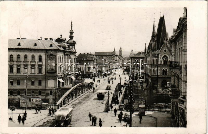 Kolozsvár, Cluj; Szamos híd környéki részlet, Segesváry & Co. és Barabás reklámja, S. Pinkler, Schieb & Co. üzlete, gyógyszertár, autóbusz, automobil / bridge, advertisement, shops, pharmacy, autobus, automobile (EK)
