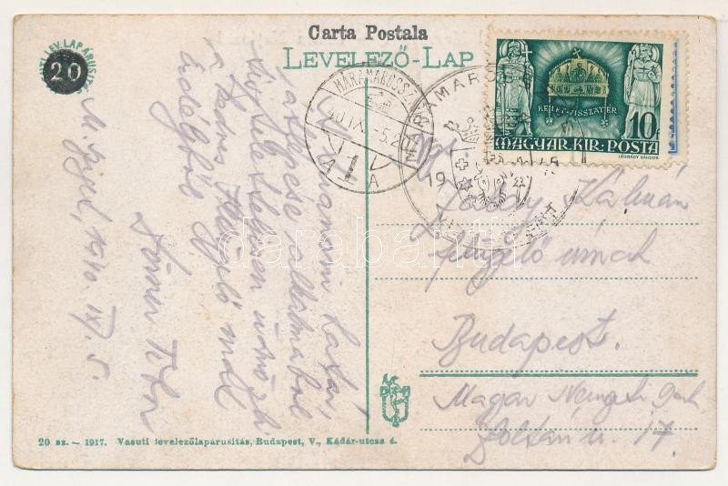 Leírás: Máramarossziget, Sighetu Marmatiei; Osztrák-Magyar Bank. Vasúti levelezőlapárusítás 20. sz. 1917. / Austro-Hungarian Bank / Banca Nationala + "1940 Máramarossziget visszatért" So. Stpl.