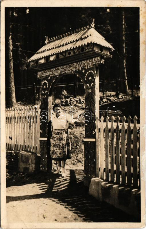 Leírás: Tusnádfürdő, Baile Tusnad; A tusnádi Élthes ház I. székelykapuja, erdélyi folklór / Transylvanian wood carved gate (ázott / wet damage)