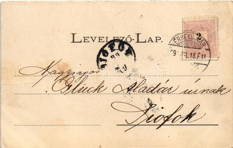 Leírás: 1899 Érsekújvár, Nové Zamky; kórház, vasútállomás, pályaudvar, Nyitra híd. Mayer fényképész kiadása / hospital, railway station, bridge. Art Nouveau, floral (lyuk / pinhole)