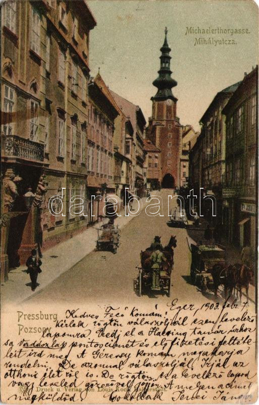 1903 Pozsony, Pressburg, Bratislava; Mihály kapu utca, üzletek. Loius ... https://www.darabanth.com/hu/513-Filatelia-kepeslap-numizmatika-mutargy-konyv-papirregiseg-ekszer-aukcio/513.0/Kepeslapok/Felvidek~513/1903-Pozsony-Pressburg-Bratislava-Mihaly-kapu-utca-uzletek-Loius-Koch-street-shops-EM~II3465921