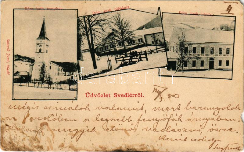 1903 Svedlér, Schwedler, Svedlár (Szepes, Zips); Római katolikus templom, plébánia és iskola télen. Szlovik Jenő kiadása / Catholic church, parish and school. Art Nouveau (b)