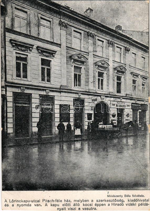 Leírás: Pozsony, Pressburg, Bratislava; A Lőrinc kapu utcai Pitsch-féle ház, Neubauer testvérek üzlete, könyvnyomda. Mindszenty Béla felvétele / printing house, shops (non PC) (vágott / cut)