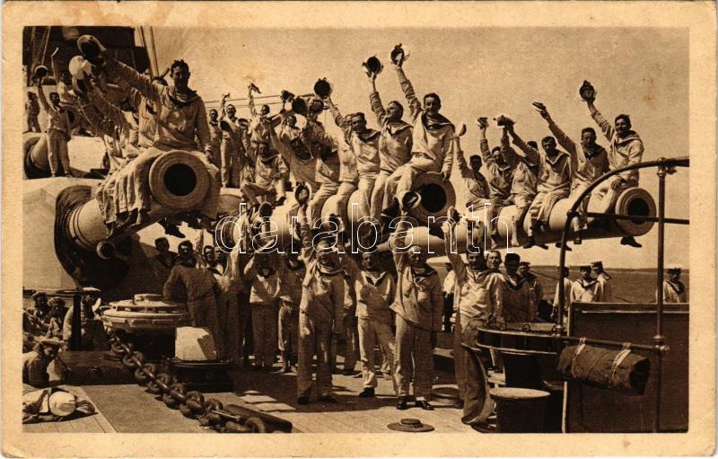Leírás: SMS Tegetthoff az Osztrák-Magyar Haditengerészet Tegetthoff-osztályú csatahajója, éljenző matrózok a fedélzeten / "Hurrah!" WWI Austro-Hungarian Navy Tegetthoff-class battleship, cheering mariners aboard. Phot A. Hauger, Nr. 1014. (kis szakadás / small tear)