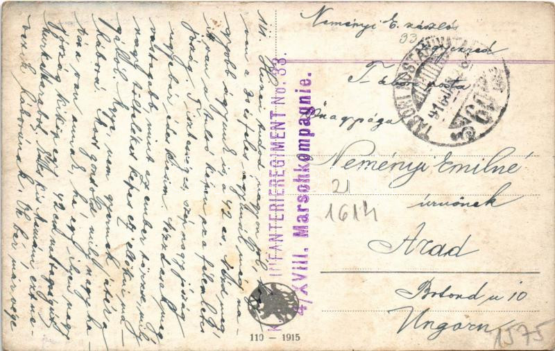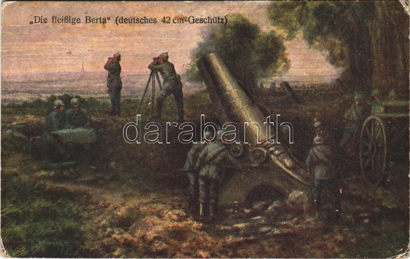 1916 A "szorgalmas Berta" útban Párizs felé (a 42-es páncélzúzó a világháború meglepetése) / Die "fleißige Berta" (deutsches 42 cm-Geschütz) / WWI German military art postcard, artillery, mortar (EK) + "K.u.K. Infanterieregiment No. 38. 4/XVHI Marschkompagnie" " Tábori postahivatal 60" (kopott sarkak / worn corners)