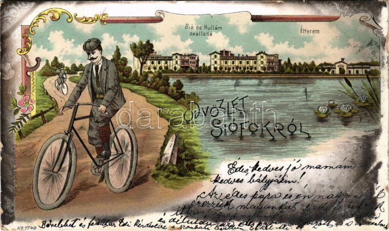 Leírás: 1899 Siófok, Sió és Hullám szálloda, étterem, férfi kerékpáron. Salamon Adolf Art Nouveau, floral, litho (kis szakadások / small tears)