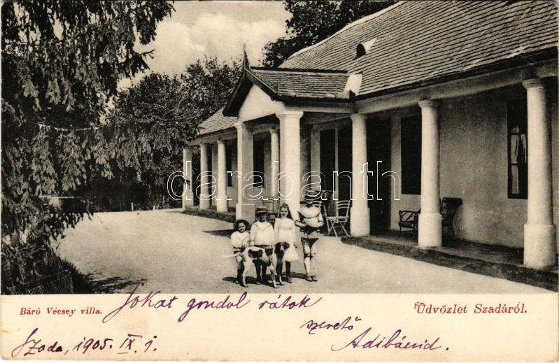 1905 Szada, Báró Vécsey villa, gyerekek kutyával (EB) https://www.darabanth.com/hu/513-Filatelia-kepeslap-numizmatika-mutargy-konyv-papirregiseg-ekszer-aukcio/513.0/Kepeslapok/Magyarorszag~511/1905-Szada-Baro-Vecsey-villa-gyerekek-kutyaval-EB~II3472211