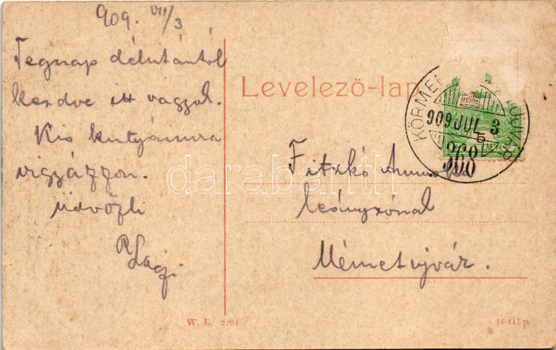 Leírás: 1909 Körmend, Állami polgári fiú és leány iskola. W.L. Bp. 2204. + "KÖRMEND - NÉMETÚJVÁR 368" vasúti mozgóposta bélyegző (Rb)