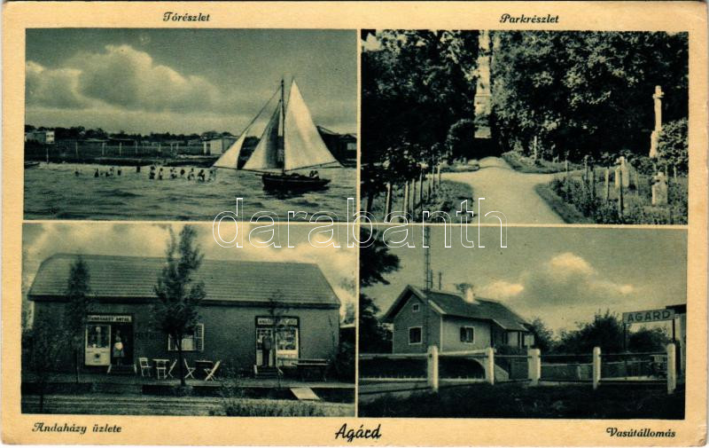 Leírás: 1939 Agárd (Gárdony), Tó részlet, fürdőzők, park, vasútállomás, Andaházy üzlete. Ifj. Andaházy Antal saját kiadása (kicsit ázott sarok / slightly wet corner)