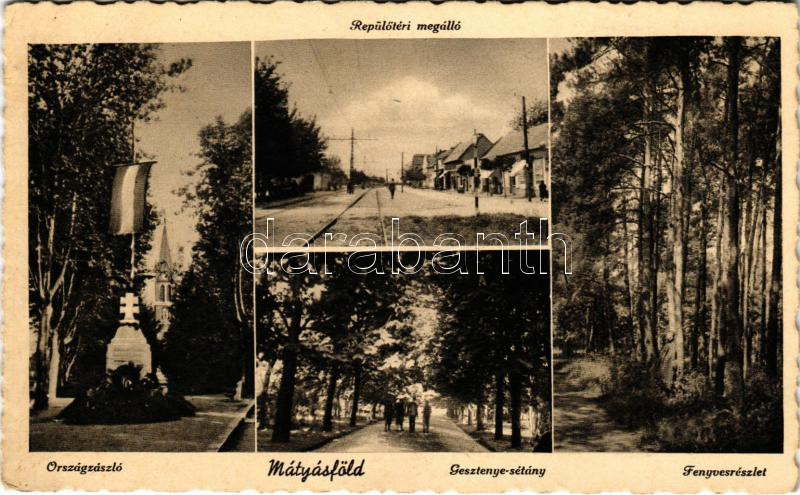 Leírás: 1939 Budapest XVI. Mátyásföld, Repülőtéri megálló, országzászló, Gesztenye sétány, Fenyves (EK)