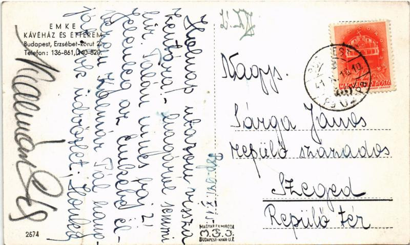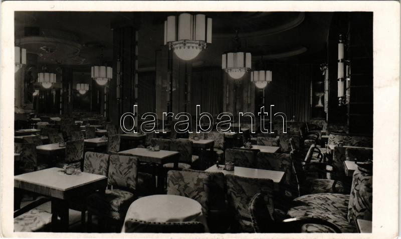 1941 Budapest VII. Emke kávéház és étterem, belső. A képeslapon az éppen ott fellépő Kalmár Pál énekes (1900-1988) aláírása látható. Erzsébet körút 2. (gyűrődés / crease)