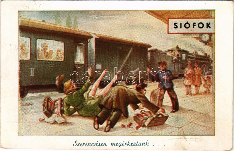 1949 Siófok, Szerencsésen megérkeztünk! humoros lap a vasútállomásról,... https://www.darabanth.com/hu/513-Filatelia-kepeslap-numizmatika-mutargy-konyv-papirregiseg-ekszer-aukcio/513.0/Kepeslapok/Magyarorszag~511/1949-Siofok-Szerencsesen-megerkeztunk-humoros-lap-a-vasutallomasrol-vonat-gyurodes-crease~II3468778