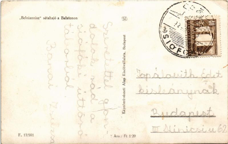 Leírás: Balaton; Beloiannisz sétahajó. Képzőművészeti Alap Kiadóvállalata. photo (gyűrődések / creases)