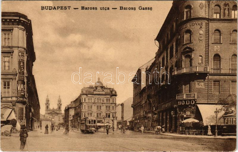 Budapest VIII. Baross utca, villamos, Ötvös és Bíró üzlete, Korányi és Fröhlich redőnygyára, Bodó kávéház, Józsefvárosi Népkör, üzletek. Fellner Mór kiadása (EK)