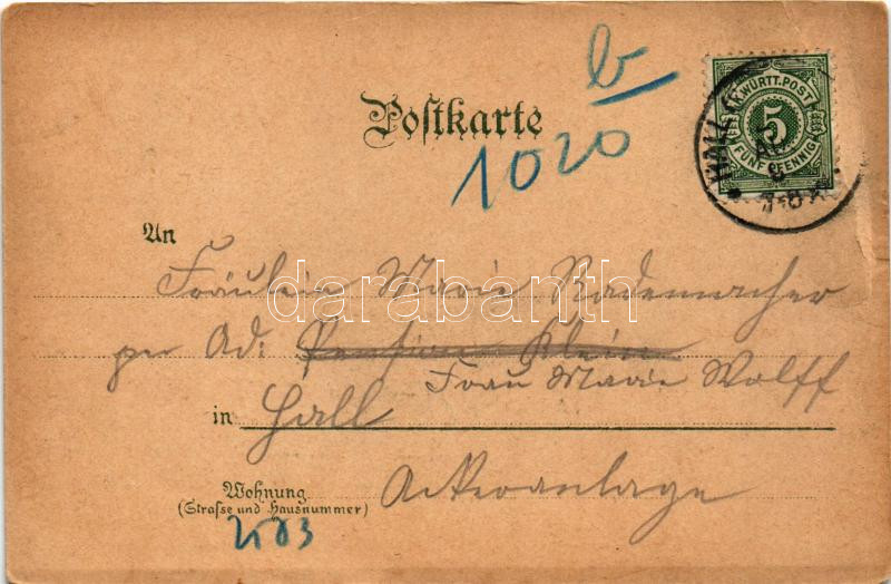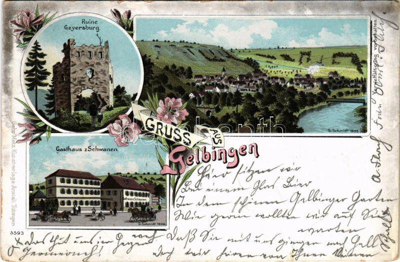 Leírás: Gelbingen, Ruine Geyersburg, Gasthaus z. Schwanen. Gebr. Metz. Kunstverlags Anstalt / castle ruins, restaurant, inn, general view. Art Nouveau, floral, litho (creases)