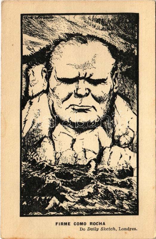 Firme Como Rocha / "Firm as a rock" WWII propaganda caricature with Winston Churchill, Prime Minister of the United Kingdom during the Second World War. Daily Sketch, London s: Clive Uptton (fa)