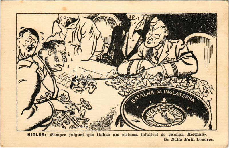 Hitler - "Sempre julguei que tinhas um sistema infalível de ganhar, Herman" Batalha da Inglaterra / "I always thought you had an infallible system for winning, Herman" WWII Anti-Nazi propaganda, mocking caricature. Adolf Hitler and Hermann Göring sitting at a roulette table, with the roulette wheel labeled "Battle of England". It satirizes the failure of the German Luftwaffe led by Göring, to defeat the Royal Air Force during the Battle of Britain in 1940. Daily Mail, London s: David Low (gyűrődés / crease)