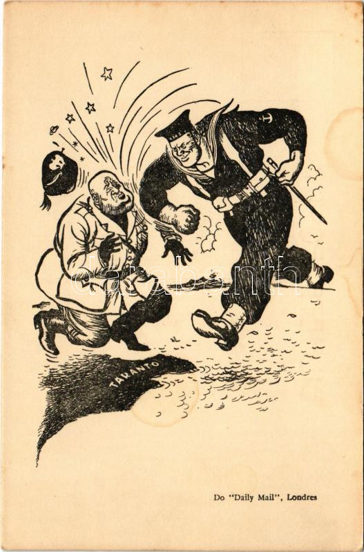Taranto / WWII Anti-Fascist propaganda, mocking caricature, that shows a British sailor punching Italian dictator Benito Mussolini in the face. The word "Taranto" referencing the Battle of Taranto on November 11-12, 1940, where the British Royal Navy launched the first all-aircraft naval attack in history. Daily Mail, London (fl)
