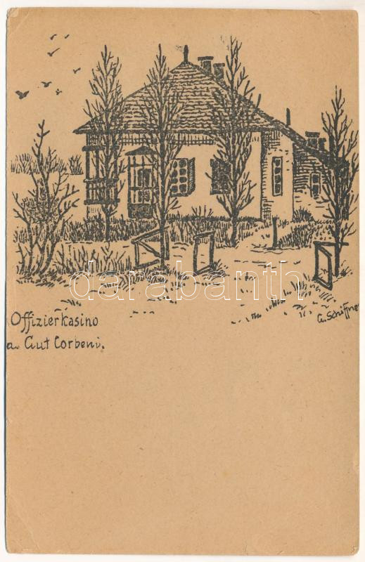 Leírás: Corbeni, Offizierkasino. Feldpostkarte / WWI German military graphic field postcard, officers' casino s: G. Schiffner (kis szakadások / small tears)
