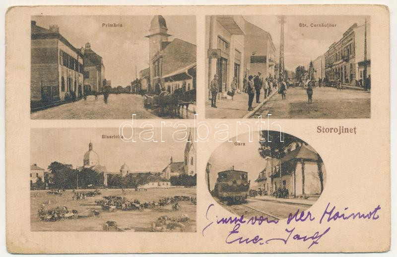Storozhynets, Storojinet, Storoschynez, Storozyniec, Storozynetz (Bukovina, Bucovina, Bukowina); Primaria, Str. Cernautilor, Bisericile, Gara. B. Zimmet / town hall, street, shops, church, railway station (Rb)